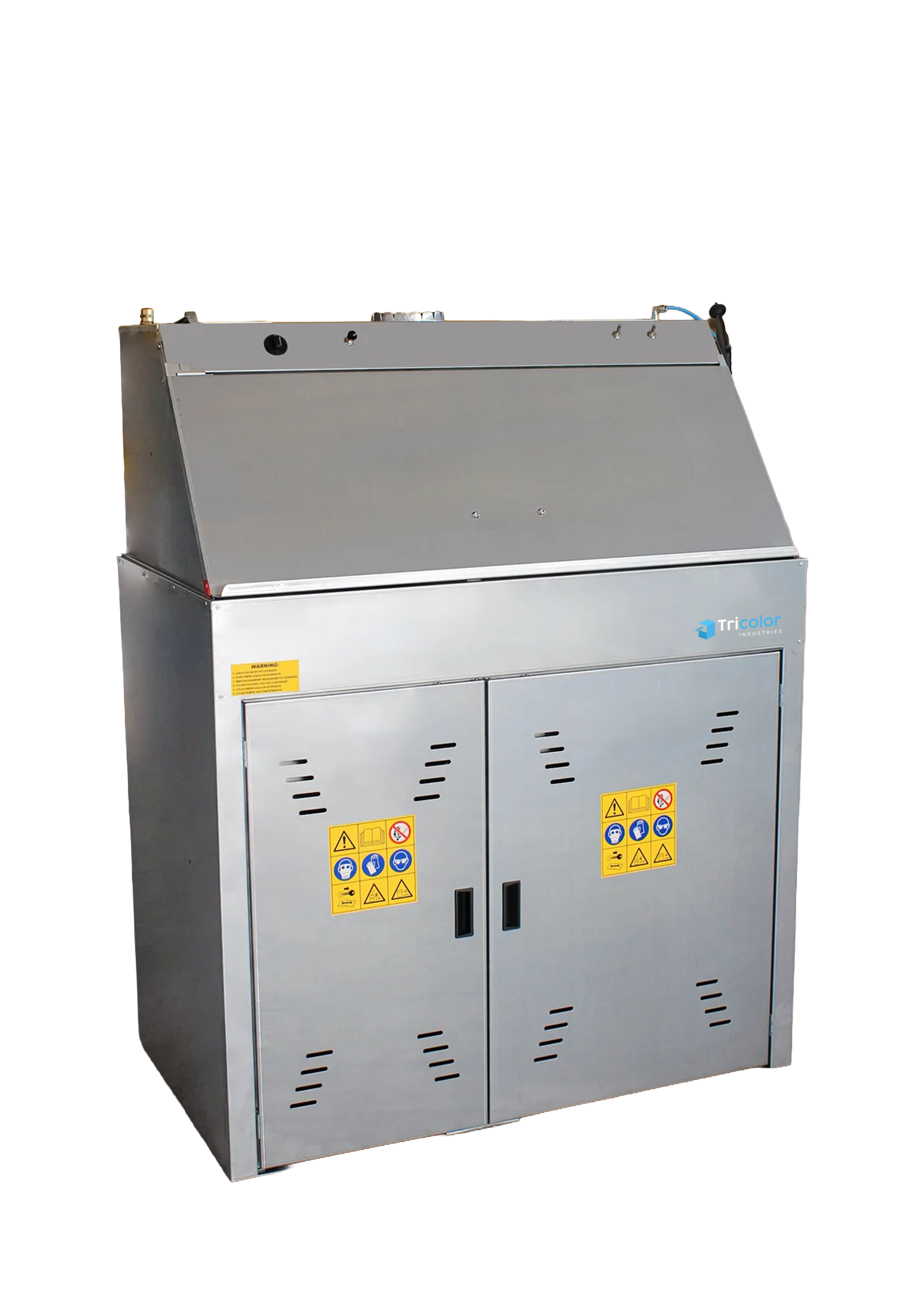 Chaque nettoyeur dispose d’un stockage pour un bidon de solvant propre et un bidon de solvant usagé de 25 litres chacuns.