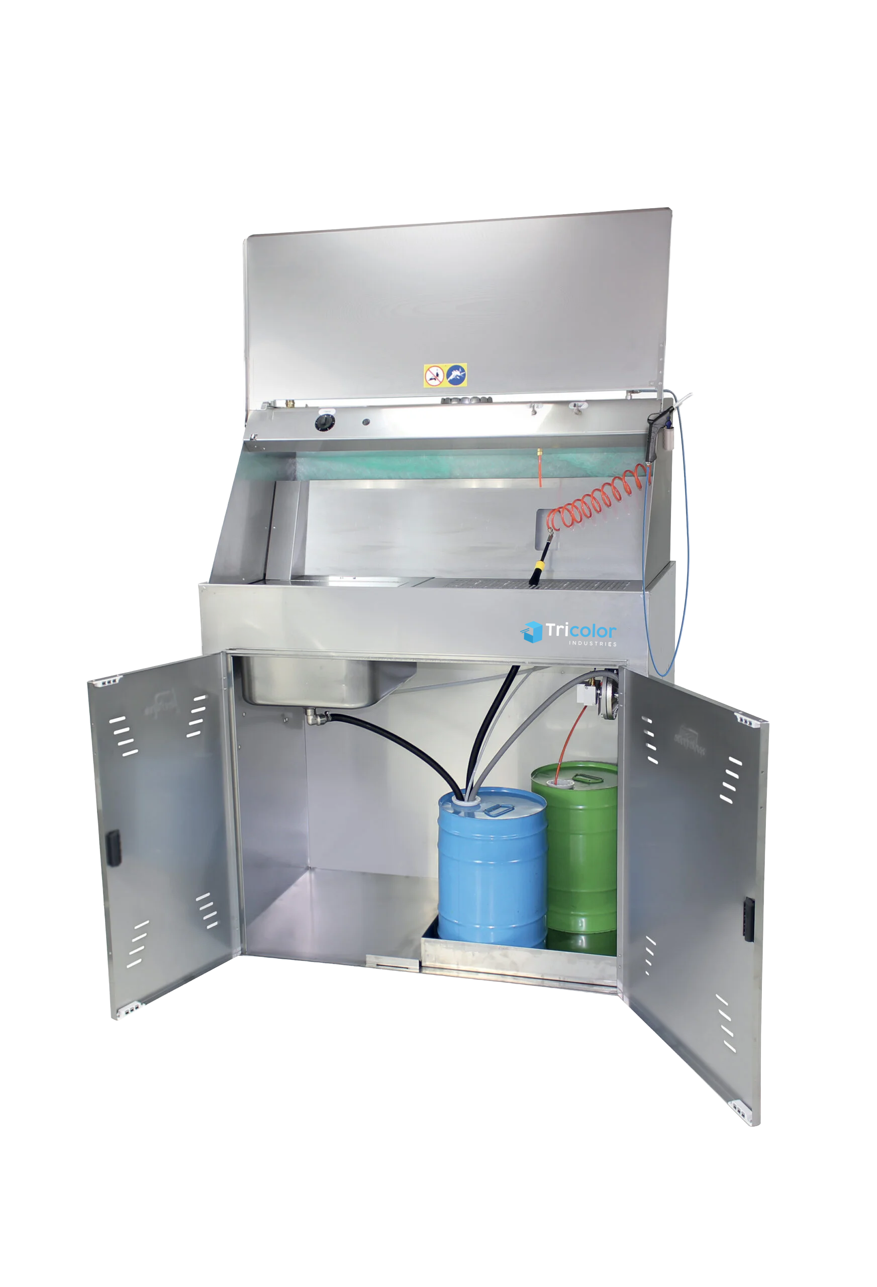 En version manuelle, le nettoyeur permet de nettoyer vos pièces à l’aide d’un pinceau alimenté en solvant usagé et d’un nébuliseur qui pulvérise un solvant propre pour le rinçage.